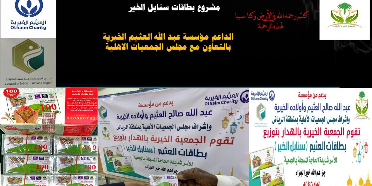 مؤسسة عبد الله العثيم الخيرية وبالتعاون مع مجلس الجمعيات الاهلية بالرياض نقدر ونشكر لكم جهودكم في دعم المسؤولية المجتمعية في هذا الوطن الغالي للمؤسسات والجمعيات الاهلية وانتم تدعمون جمعية الهدار الخيرية بعدد 250 بطاقة سنابل الخير لمستفيدي الجمعية الخيرية بالهدار جعله الله في ميزان حسناتكم بدعم الجمعية بعدد 250 بطاقة قيمة البطاقة 100 ريال